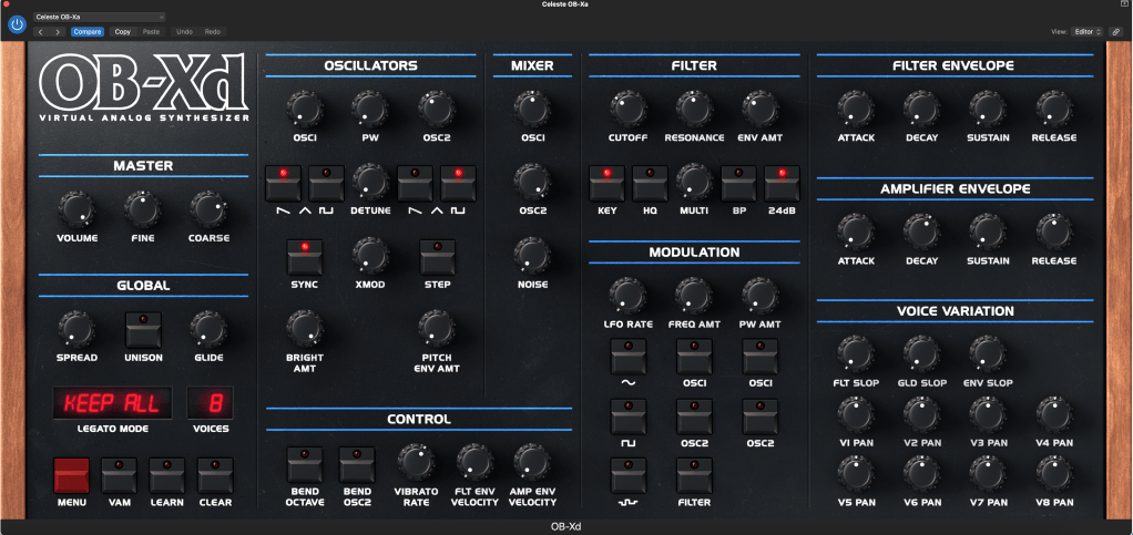 Finally I decided that the verse section needed something to add interest so I though something quite low key and delicate would contrast well with the chorus. I selected a Celeste setting using the OBXd Oberheim soft synth, which is a favourite of mine and again added the MIDI arpeggio effect.
